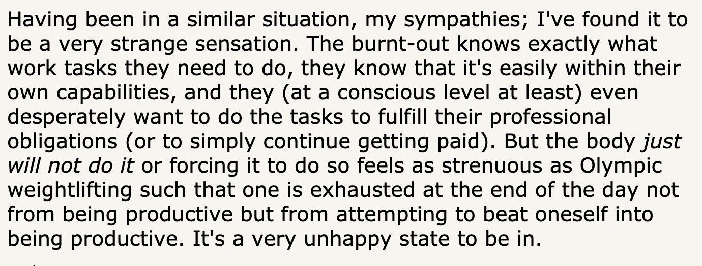 The actual state of “burnout” is the end result of this process. This comment from Hacker News describes the subjective experience of it pretty well: