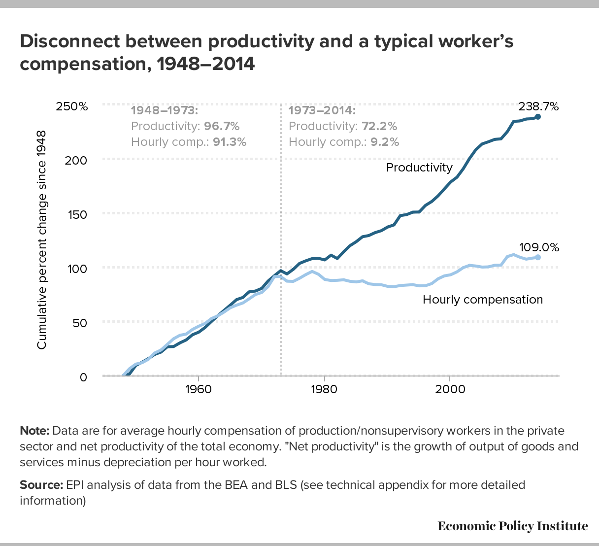 It’s now widely known, for example, that worker purchasing power has not at all kept up with worker productivity since the 1970s. Minimum wage hasn’t even kept up with inflation. This, as much as any other recent political or ecological catastrophe (though many are related), is the fire.